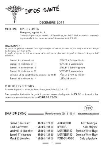 Mardi 20 décembre 15h30 à 19h00 PONT-DE-ROIDE Salle polyvalente