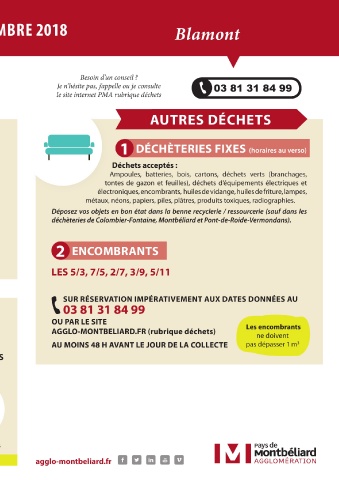 Besoin d’un conseil ? Je n’hésite pas, j’appelle ou je consulte le site internet PMA rubrique déchets 1 Déchets acceptés : ENCOMBRANTS 2 LES 5/3, 7/5, 2/7, 3/9, 5/11 03 81 31 84 99 OU PAR LE SITE AGGLO-MONTBELIARD.FR (rubrique déchets) AU MOINS 48 H AVANT LE JOUR DE LA COLLECTE La liste complète de vos sorties du printemps sur agglo-montbeliard.fr Suivez-nous agglo-montbeliard.fr