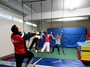 Travail sur un trapèze en hauteur. Jonglage avec